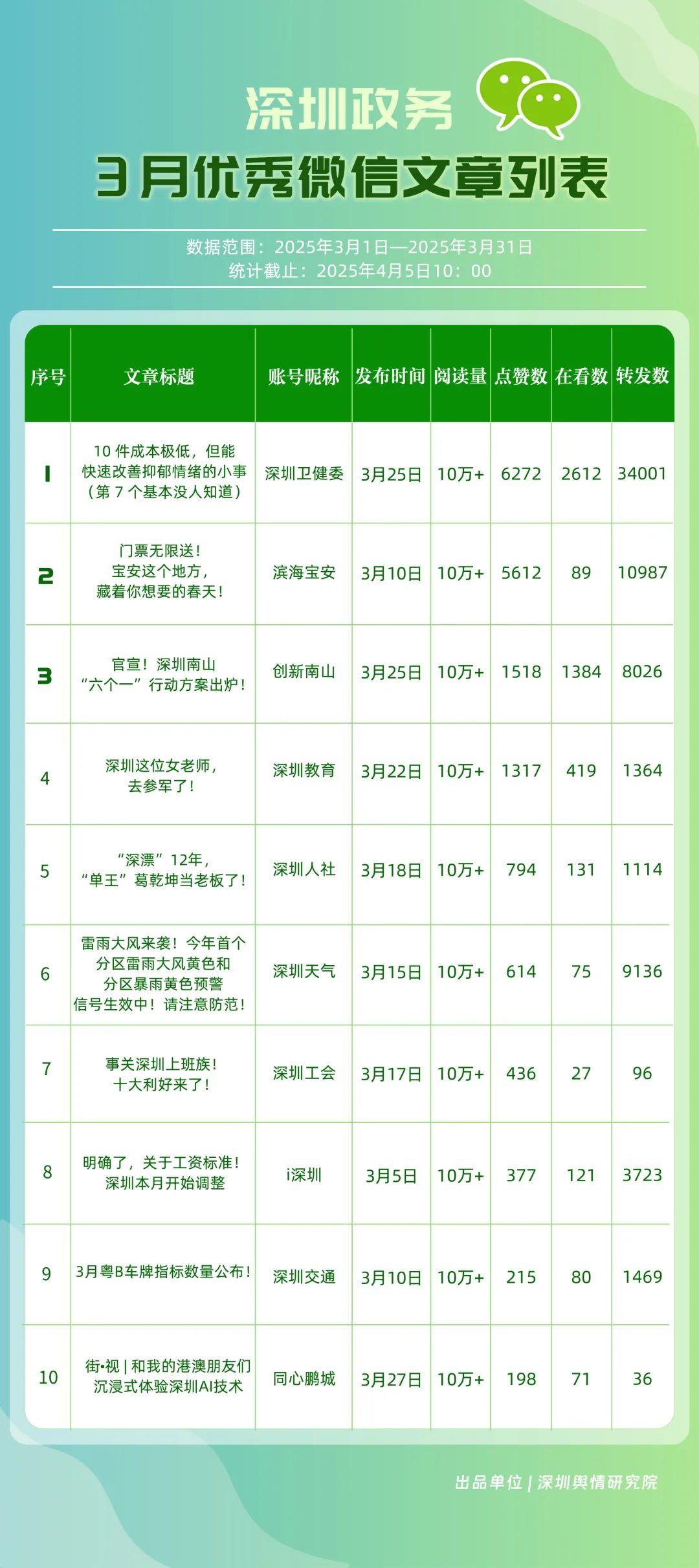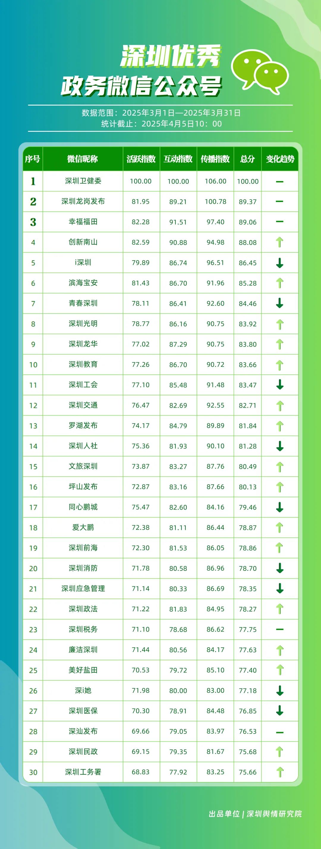 3月,包括“深圳衛(wèi)健委”“深圳龍崗發(fā)布”“幸福福田”“創(chuàng)新南山”“i深圳”“濱海寶安”“青春深圳”“深圳光明”“深圳龍華”“深圳教育”等在內(nèi)的30個賬號入選“深圳優(yōu)秀政務微信公眾號”。其中,“深圳衛(wèi)健委”超70篇文章閱讀量達10萬次以上,穩(wěn)居榜單首位;“深圳龍崗發(fā)布”也取得較好傳播效果,在3月產(chǎn)出10余篇閱讀量超10萬次的熱門文章,位于榜單第二位;“幸福福田”也積極發(fā)布高質(zhì)量內(nèi)容,穩(wěn)住榜單第三位置;緊隨其后的是“創(chuàng)新南山”“i深圳”“濱海寶安”,總分均在85分以上。這充分展現(xiàn)了深圳新媒體傳播生態(tài)體系中,各主體的傳播優(yōu)勢與影響力版圖正逐漸凸顯。