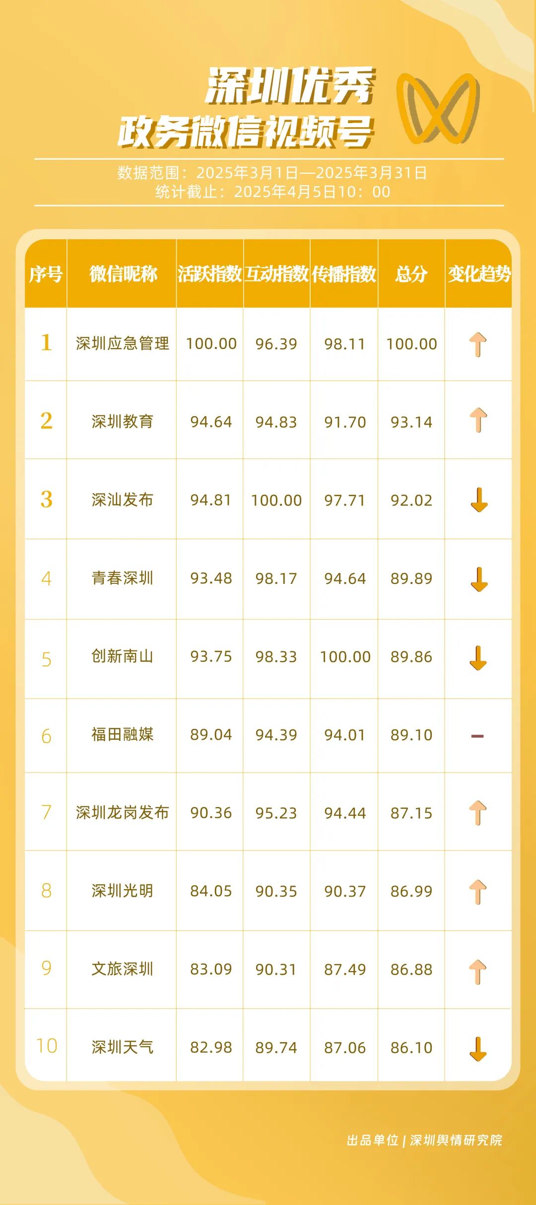 《深圳優(yōu)秀政務新媒體矩陣》將深圳黨政機關、企事業(yè)單位開設的政務公眾號(微信)、微博號、抖音號、視頻號(微信)及頭條號按照活躍指數(shù)、互動指數(shù)、傳播指數(shù)三項指標進行綜合評價,最終形成優(yōu)秀名單。