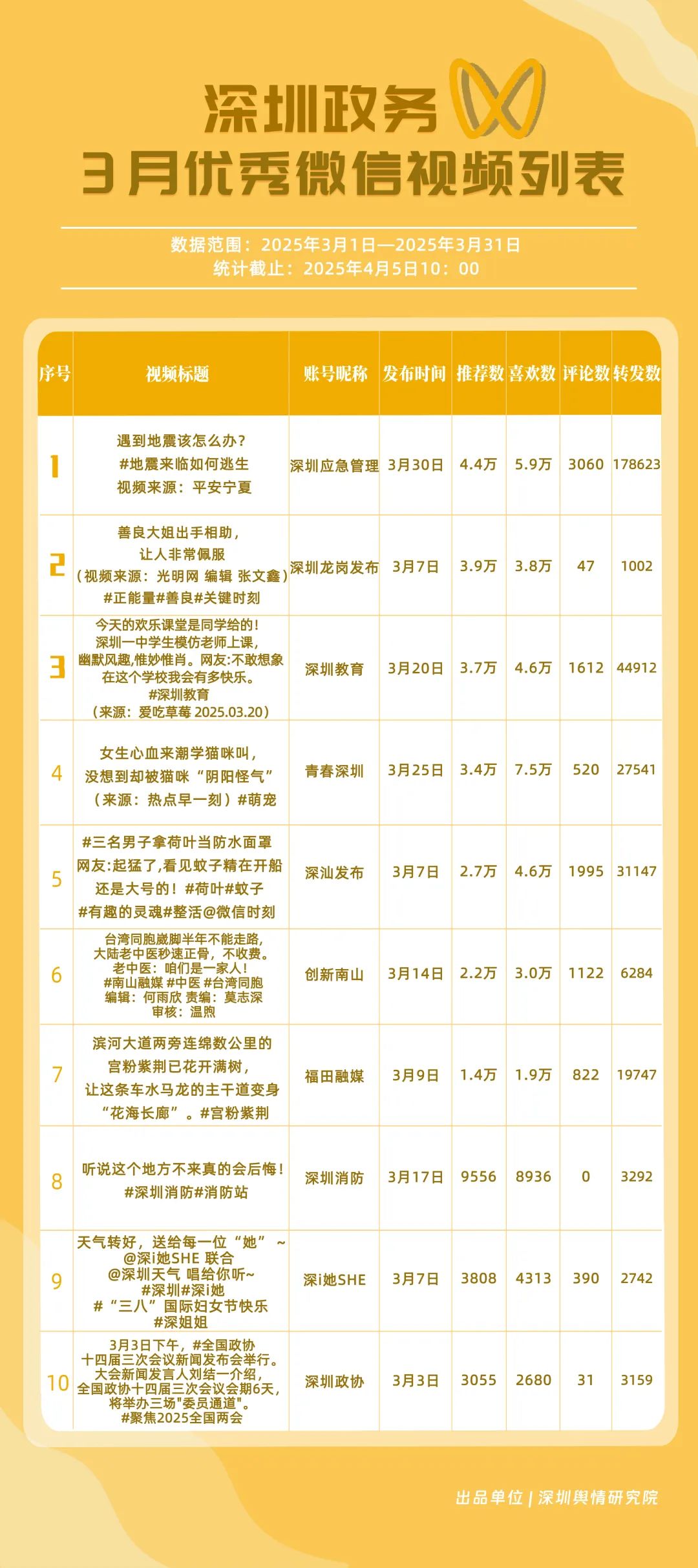 3月,獲“深圳優(yōu)秀政務微信視頻號”稱號的分別是“深圳應急管理”“深圳教育”“深汕發(fā)布”“青春深圳”“創(chuàng)新南山”“福田融媒”“深圳龍崗發(fā)布”“深圳光明”“文旅深圳”“深圳天氣”。其中,“深圳應急管理”以20余篇作品收獲超20萬次轉(zhuǎn)發(fā),躍居第一名,一期有關“地震來臨如何逃生”的視頻收獲超17萬次轉(zhuǎn)發(fā),展現(xiàn)了其內(nèi)容的高實用性?!吧钲诮逃薄吧钌前l(fā)布”位于榜單第二、三位,總分超90分,反映出兩賬號在民生教育、區(qū)域宣傳領域擁有較好傳播效果?!扒啻荷钲凇薄皠?chuàng)新南山”“福田融媒”等賬號也在3月發(fā)布優(yōu)質(zhì)視頻內(nèi)容,展現(xiàn)了深圳政務新媒體在視頻號平臺宣傳的創(chuàng)新探索。