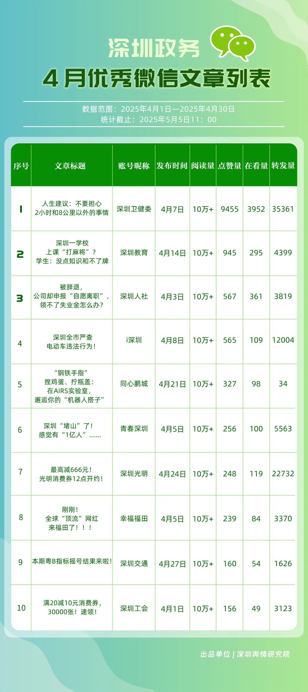 4月,包括“深圳衛(wèi)健委”“深圳龍崗發(fā)布”“幸福福田”“深圳光明”“i深圳”“創(chuàng)新南山”“青春深圳”“深圳交通”“深圳教育”“濱海寶安”等在內(nèi)的30個賬號入選“深圳優(yōu)秀政務(wù)微信公眾號”。其中,“深圳衛(wèi)健委”在活躍指數(shù)、互動指數(shù)、傳播指數(shù)上均拿到滿分,4月共有67篇推文閱讀量超10萬次,綜合得分穩(wěn)居榜單首位;“深圳龍崗發(fā)布”同樣表現(xiàn)亮眼,4月共產(chǎn)出13篇閱讀量超10萬次的爆款文章,綜合得分排名第二位;“幸福福田”則憑借持續(xù)輸出的高質(zhì)量內(nèi)容,排在榜單第三位?!吧钲诠饷鳌薄癷深圳”“創(chuàng)新南山”“青春深圳”也憑借扎實的內(nèi)容功底與良好的運營策略,總分超85分。上榜賬號的亮眼成績,不僅彰顯了各自的傳播優(yōu)勢,更展現(xiàn)出各新媒體矩陣在微信公眾平臺的傳播勢能正持續(xù)攀升。