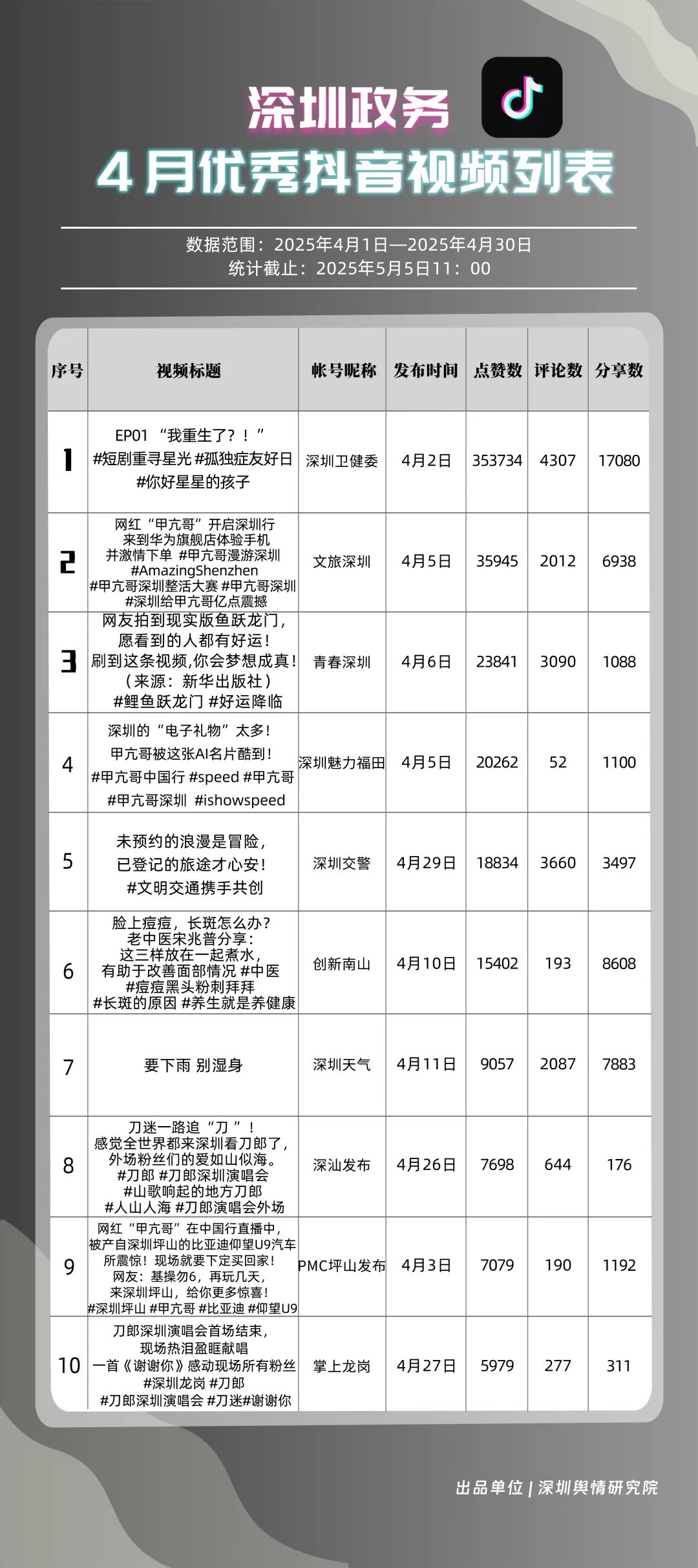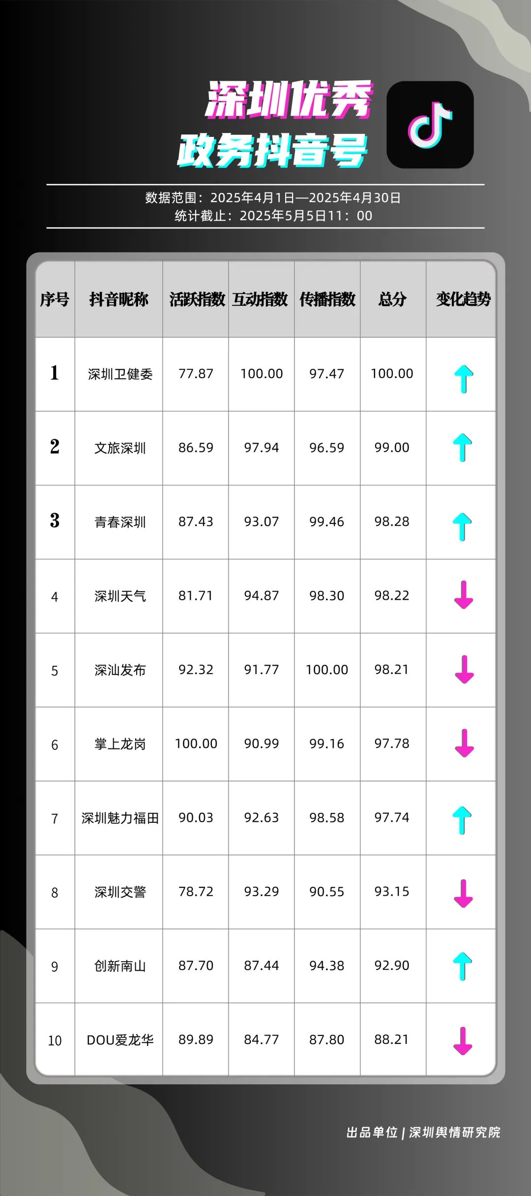 4月,“深圳衛(wèi)健委”“文旅深圳”“青春深圳”“深圳天氣”“深汕發(fā)布”“掌上龍崗”“深圳魅力福田”“深圳交警”“創(chuàng)新南山”“DOU愛龍華”共10個政務(wù)抖音號獲得“優(yōu)秀政務(wù)抖音號”稱號。4月,“深圳衛(wèi)健委”“文旅深圳”“青春深圳”憑借新穎的內(nèi)容策劃、生動的短視頻呈現(xiàn)方式,實現(xiàn)排名提升,位居榜單前三。“深圳天氣”“深汕發(fā)布”緊隨其后,以優(yōu)質(zhì)實用的內(nèi)容、接地氣的表達(dá),持續(xù)擴(kuò)大政務(wù)新媒體的傳播聲量。上榜賬號積極探索創(chuàng)新傳播路徑,以生動有趣的方式傳遞政務(wù)信息,為深圳政務(wù)新媒體在短視頻領(lǐng)域的發(fā)展注入新活力。