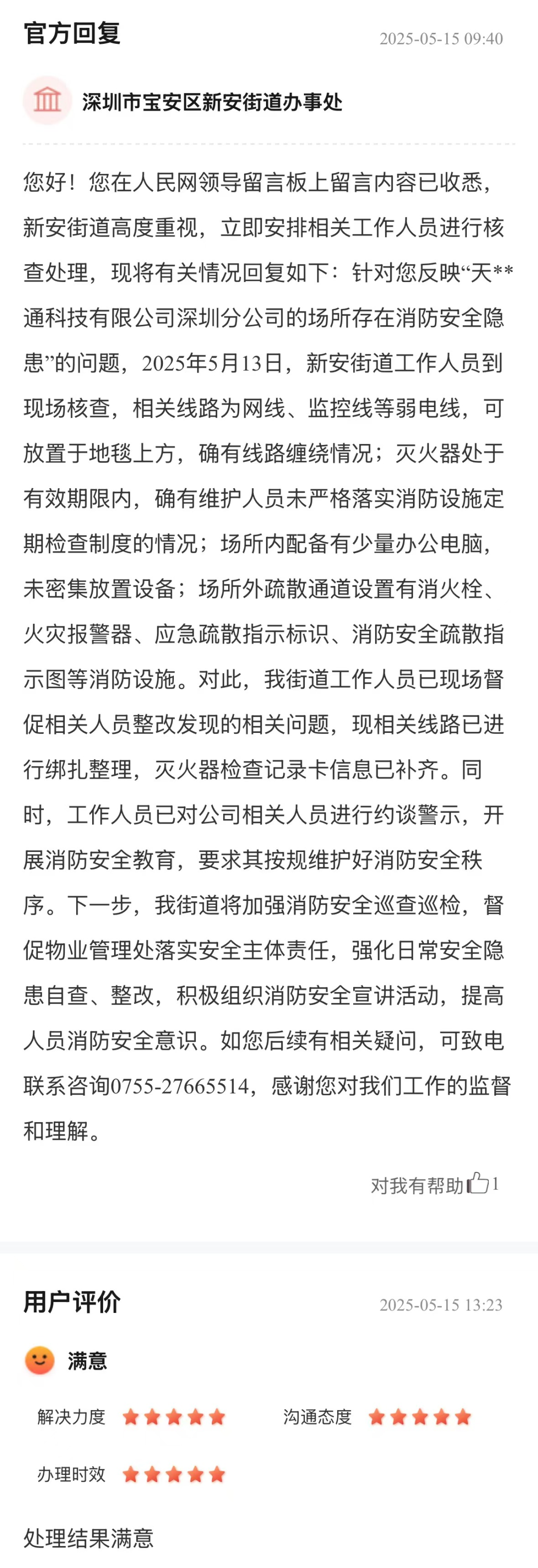 企業(yè)電氣線路混亂、滅火器維護(hù)缺位等消防隱患,直接威脅員工生命財產(chǎn)安全,更潛藏重大事故風(fēng)險。街道辦收到市民反饋后,迅速核查并高效解決現(xiàn)存問題,以“即知即改”的行動力回應(yīng)群眾關(guān)切。后續(xù)通過約談警示、安全宣教等舉措,從“治已病”轉(zhuǎn)向“防未病”,切實筑牢區(qū)域消防安全屏障,展現(xiàn)基層對安全隱患的快速治理能力,傳遞出“民生安全無小事”的責(zé)任擔(dān)當(dāng),獲得網(wǎng)民的五星好評。