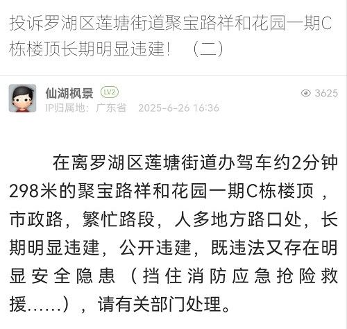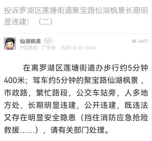 14. 帖文《投訴羅湖區(qū)蓮塘街道聚寶路仙湖楓景長(zhǎng)期明顯違建?。ǘ?/a>》