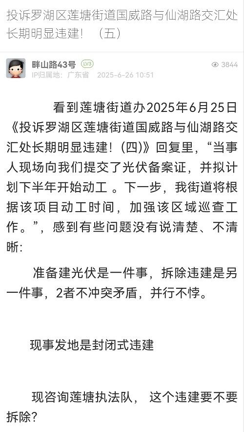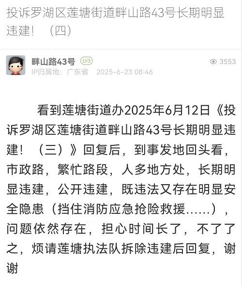 3. 帖文《投訴羅湖區(qū)蓮塘街道畔山路43號(hào)長(zhǎng)期明顯違建?。ㄋ模?/a>》
