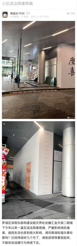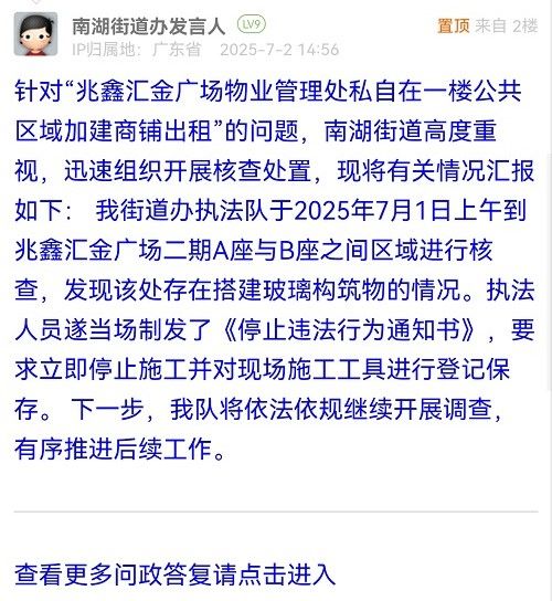 針對(duì)“兆鑫匯金廣場(chǎng)物業(yè)管理處私自在一樓公共區(qū)域加建商鋪出租”的問題,南湖街道高度重視,迅速組織開展核查處置,現(xiàn)將有關(guān)情況匯報(bào)如下: 我街道辦執(zhí)法隊(duì)于2025年7月1日上午到兆鑫匯金廣場(chǎng)二期A座與B座之間區(qū)域進(jìn)行核查,發(fā)現(xiàn)該處存在搭建玻璃構(gòu)筑物的情況。執(zhí)法人員遂當(dāng)場(chǎng)制發(fā)了《停止違法行為通知書》,要求立即停止施工并對(duì)現(xiàn)場(chǎng)施工工具進(jìn)行登記保存。 下一步,我隊(duì)將依法依規(guī)繼續(xù)開展調(diào)查,有序推進(jìn)后續(xù)工作。