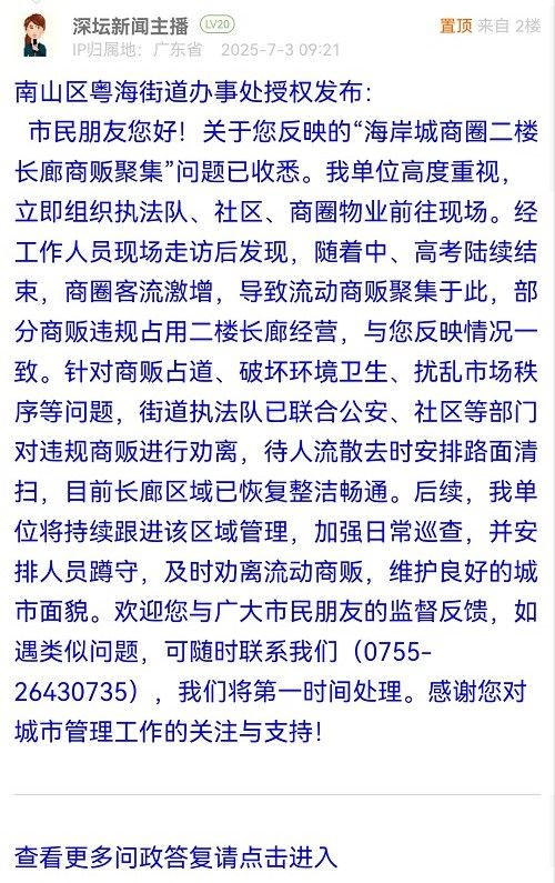 市民朋友您好!關(guān)于您反映的“海岸城商圈二樓長(zhǎng)廊商販聚集”問題已收悉。我單位高度重視,立即組織執(zhí)法隊(duì)、社區(qū)、商圈物業(yè)前往現(xiàn)場(chǎng)。經(jīng)工作人員現(xiàn)場(chǎng)走訪后發(fā)現(xiàn),隨著中、高考陸續(xù)結(jié)束,商圈客流激增,導(dǎo)致流動(dòng)商販聚集于此,部分商販違規(guī)占用二樓長(zhǎng)廊經(jīng)營(yíng),與您反映情況一致。針對(duì)商販占道、破壞環(huán)境衛(wèi)生、擾亂市場(chǎng)秩序等問題,街道執(zhí)法隊(duì)已聯(lián)合公安、社區(qū)等部門對(duì)違規(guī)商販進(jìn)行勸離,待人流散去時(shí)安排路面清掃,目前長(zhǎng)廊區(qū)域已恢復(fù)整潔暢通。后續(xù),我單位將持續(xù)跟進(jìn)該區(qū)域管理,加強(qiáng)日常巡查,并安排人員蹲守,及時(shí)勸離流動(dòng)商販,維護(hù)良好的城市面貌。歡迎您與廣大市民朋友的監(jiān)督反饋,如遇類似問題,可隨時(shí)聯(lián)系我們(0755-26430735),我們將第一時(shí)間處理。感謝您對(duì)城市管理工作的關(guān)注與支持!