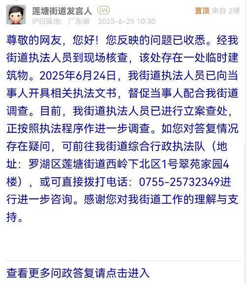 尊敬的網(wǎng)友,您好!您反映的問題已收悉。經(jīng)我街道執(zhí)法人員到現(xiàn)場(chǎng)核查,該處存在一處臨時(shí)建筑物。2025年6月24日,我街道執(zhí)法人員已向當(dāng)事人開具相關(guān)執(zhí)法文書,督促當(dāng)事人配合我街道調(diào)查。目前,我街道執(zhí)法人員已進(jìn)行立案查處,正按照?qǐng)?zhí)法程序作進(jìn)一步調(diào)查。如您對(duì)答復(fù)情況存在疑問,可前往我街道綜合行政執(zhí)法隊(duì)(地址:羅湖區(qū)蓮塘街道西嶺下北區(qū)1號(hào)翠苑家園4樓),或可直接撥打電話:0755-25732349進(jìn)行進(jìn)一步咨詢。感謝您對(duì)我街道工作的理解與支持。