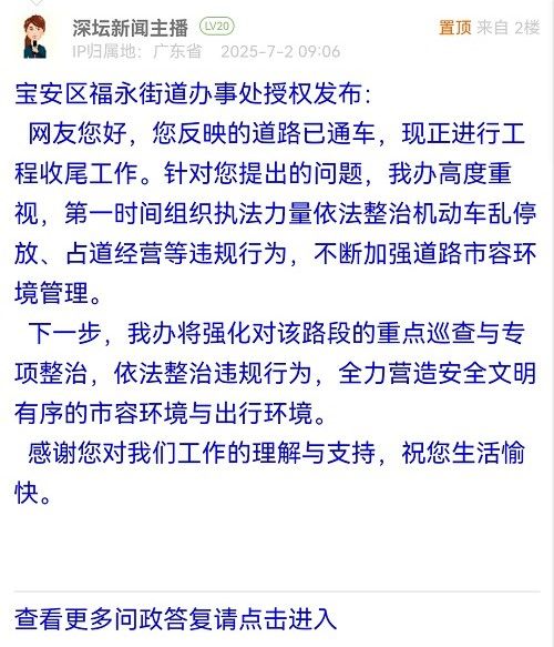 據(jù)統(tǒng)計(jì),2025年6月23日-2025年6月29日,網(wǎng)友在深圳論壇發(fā)布問政類帖文共28篇,得到相關(guān)單位正式回應(yīng)的帖文數(shù)為28篇,本期簡(jiǎn)報(bào)回應(yīng)速度最快的單位:市交警局福田大隊(duì)、市交警局龍崗大隊(duì)、羅湖區(qū)蓮塘街道辦事處。