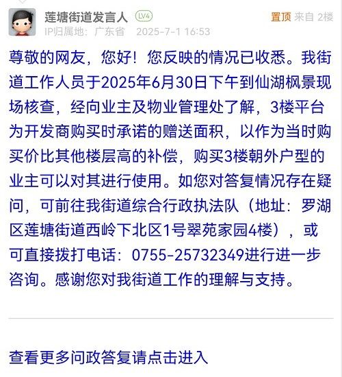 尊敬的網(wǎng)友,您好!您反映的情況已收悉。我街道工作人員于2025年6月30日下午到仙湖楓景現(xiàn)場(chǎng)核查,經(jīng)向業(yè)主及物業(yè)管理處了解,3樓平臺(tái)為開發(fā)商購(gòu)買時(shí)承諾的贈(zèng)送面積,以作為當(dāng)時(shí)購(gòu)買價(jià)比其他樓層高的補(bǔ)償,購(gòu)買3樓朝外戶型的業(yè)主可以對(duì)其進(jìn)行使用。如您對(duì)答復(fù)情況存在疑問,可前往我街道綜合行政執(zhí)法隊(duì)(地址:羅湖區(qū)蓮塘街道西嶺下北區(qū)1號(hào)翠苑家園4樓),或可直接撥打電話:0755-25732349進(jìn)行進(jìn)一步咨詢。感謝您對(duì)我街道工作的理解與支持。