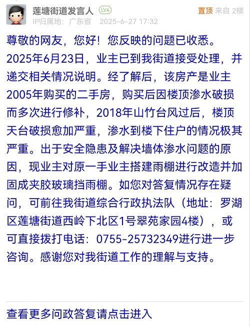 尊敬的網(wǎng)友,您好!您反映的問題已收悉。2025年6月23日,業(yè)主已到我街道接受處理,并遞交相關(guān)情況說明。經(jīng)了解后,該房產(chǎn)是業(yè)主2005年購(gòu)買的二手房,購(gòu)買后因樓頂滲水破損而多次進(jìn)行修補(bǔ),2018年山竹臺(tái)風(fēng)過后,樓頂天臺(tái)破損愈加嚴(yán)重,滲水到樓下住戶的情況極其嚴(yán)重。出于安全隱患及解決墻體滲水問題的原因,現(xiàn)業(yè)主對(duì)原一手業(yè)主搭建雨棚進(jìn)行改造并加固成夾膠玻璃擋雨棚。如您對(duì)答復(fù)情況存在疑問,可前往我街道綜合行政執(zhí)法隊(duì)(地址:羅湖區(qū)蓮塘街道西嶺下北區(qū)1號(hào)翠苑家園4樓),或可直接撥打電話:0755-25732349進(jìn)行進(jìn)一步咨詢。感謝您對(duì)我街道工作的理解與支持。