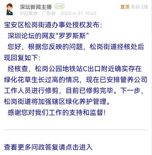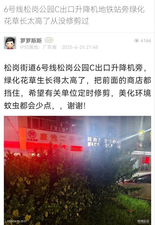 9. 帖文 《6號(hào)線松崗公園C出口升降機(jī)地鐵站旁綠化花草長(zhǎng)太高了從沒修剪過》