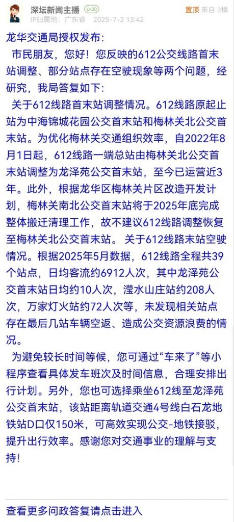關(guān)于612線路首末站調(diào)整情況。612線路原起止站為中海錦城花園公交首末站和梅林關(guān)北公交首末站。為優(yōu)化梅林關(guān)交通組織效率,自2022年8月1日起,612線路一端總站由梅林關(guān)北公交首末站調(diào)整為龍澤苑公交首末站,至今已運(yùn)營(yíng)近3年。此外,根據(jù)龍華區(qū)梅林關(guān)片區(qū)改造開發(fā)計(jì)劃,梅林關(guān)南北公交首末站將于2025年底完成整體搬遷清理工作,故不建議612線路調(diào)整恢復(fù)至梅林關(guān)北公交首末站。 關(guān)于612線路末站空駛情況。根據(jù)2025年5月數(shù)據(jù),612線路全程共39個(gè)站點(diǎn),日均客流約6912人次,其中龍澤苑公交首末站日均約10人次,瀅水山莊站約208人次,萬家燈火站約72人次等,未發(fā)現(xiàn)相關(guān)站點(diǎn)存在最后幾站車輛空返、造成公交資源浪費(fèi)的情況。