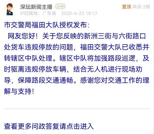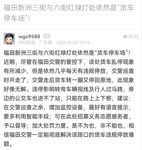 5. 帖文《福田新洲三街與六街紅綠燈處依然是“貨車停車場(chǎng)”!》