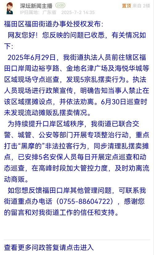 如您想反饋福田口岸其他管理問題,可聯(lián)系我街道重點(diǎn)辦電話(0755-88604722),感謝您的留言和對(duì)我街道工作的信任和支持。