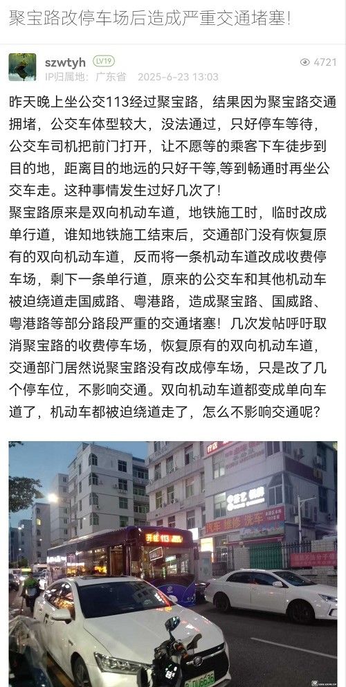 4. 帖文《聚寶路改停車場(chǎng)后造成嚴(yán)重交通堵塞!》