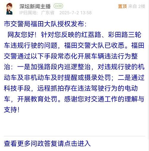 網(wǎng)友您好!針對(duì)您反映的紅荔路、彩田路三輪車違規(guī)行駛的問題,福田交警大隊(duì)已收悉。福田交警通過以下手段常態(tài)化開展車輛違法行為整治:一是加強(qiáng)路段內(nèi)巡邏整治,對(duì)違規(guī)行駛的機(jī)動(dòng)車及非機(jī)動(dòng)車及時(shí)提醒或攝錄處罰;二是通過科技手段,遠(yuǎn)程抓拍存在違法駕駛行為的電動(dòng)車,開展教育處罰。感謝您對(duì)交通工作的理解與支持!