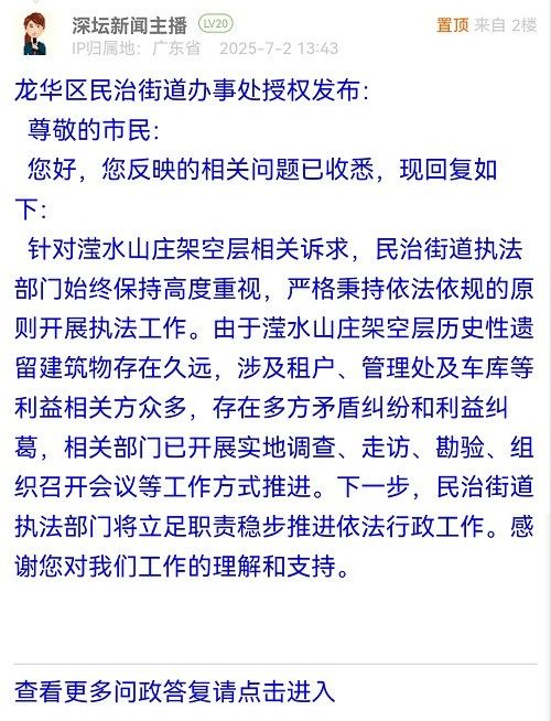 針對(duì)瀅水山莊架空層相關(guān)訴求,民治街道執(zhí)法部門始終保持高度重視,嚴(yán)格秉持依法依規(guī)的原則開展執(zhí)法工作。由于瀅水山莊架空層歷史性遺留建筑物存在久遠(yuǎn),涉及租戶、管理處及車庫(kù)等利益相關(guān)方眾多,存在多方矛盾糾紛和利益糾葛,相關(guān)部門已開展實(shí)地調(diào)查、走訪、勘驗(yàn)、組織召開會(huì)議等工作方式推進(jìn)。下一步,民治街道執(zhí)法部門將立足職責(zé)穩(wěn)步推進(jìn)依法行政工作。感謝您對(duì)我們工作的理解和支持。