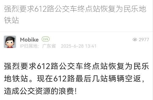 19. 帖文《強(qiáng)烈要求612路公交車終點(diǎn)站恢復(fù)為民樂地鐵站》