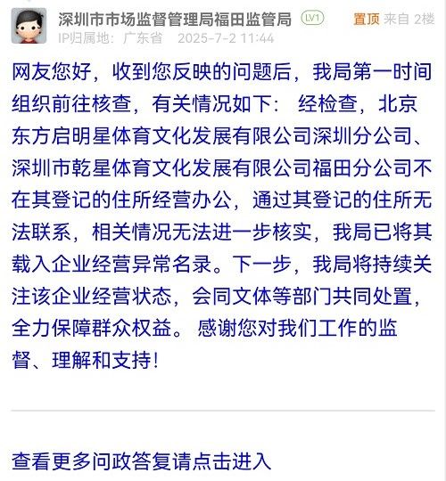 網(wǎng)友您好,收到您反映的問題后,我局第一時(shí)間組織前往核查,有關(guān)情況如下: 經(jīng)檢查,北京東方啟明星體育文化發(fā)展有限公司深圳分公司、深圳市乾星體育文化發(fā)展有限公司福田分公司不在其登記的住所經(jīng)營(yíng)辦公,通過其登記的住所無法聯(lián)系,相關(guān)情況無法進(jìn)一步核實(shí),我局已將其載入企業(yè)經(jīng)營(yíng)異常名錄。下一步,我局將持續(xù)關(guān)注該企業(yè)經(jīng)營(yíng)狀態(tài),會(huì)同文體等部門共同處置,全力保障群眾權(quán)益。 感謝您對(duì)我們工作的監(jiān)督、理解和支持!