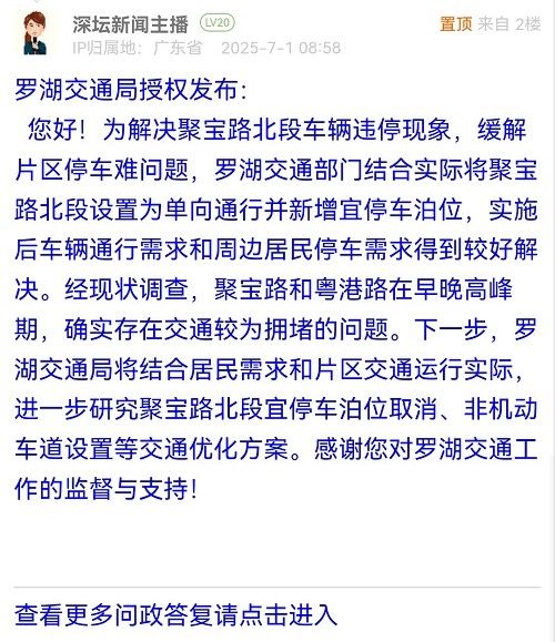 您好!為解決聚寶路北段車輛違?,F(xiàn)象,緩解片區(qū)停車難問題,羅湖交通部門結(jié)合實(shí)際將聚寶路北段設(shè)置為單向通行并新增宜停車泊位,實(shí)施后車輛通行需求和周邊居民停車需求得到較好解決。經(jīng)現(xiàn)狀調(diào)查,聚寶路和粵港路在早晚高峰期,確實(shí)存在交通較為擁堵的問題。下一步,羅湖交通局將結(jié)合居民需求和片區(qū)交通運(yùn)行實(shí)際,進(jìn)一步研究聚寶路北段宜停車泊位取消、非機(jī)動(dòng)車道設(shè)置等交通優(yōu)化方案。感謝您對(duì)羅湖交通工作的監(jiān)督與支持!