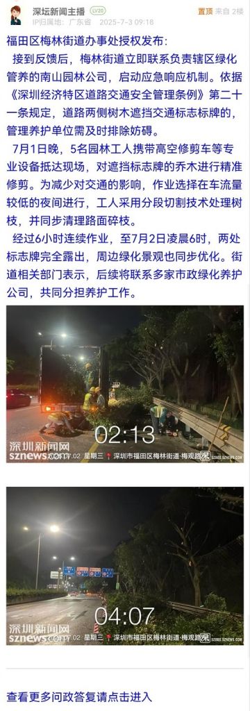 接到反饋后,梅林街道立即聯(lián)系負(fù)責(zé)轄區(qū)綠化管養(yǎng)的南山園林公司,啟動(dòng)應(yīng)急響應(yīng)機(jī)制。依據(jù)《深圳經(jīng)濟(jì)特區(qū)道路交通安全管理?xiàng)l例》第二十一條規(guī)定,道路兩側(cè)樹木遮擋交通標(biāo)志標(biāo)牌的,管理養(yǎng)護(hù)單位需及時(shí)排除妨礙。