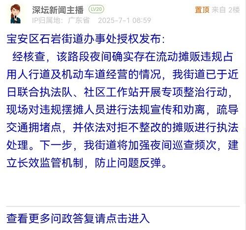 經(jīng)核查,該路段夜間確實(shí)存在流動(dòng)攤販違規(guī)占用人行道及機(jī)動(dòng)車道經(jīng)營(yíng)的情況,我街道已于近日聯(lián)合執(zhí)法隊(duì)、社區(qū)工作站開展專項(xiàng)整治行動(dòng),現(xiàn)場(chǎng)對(duì)違規(guī)擺攤?cè)藛T進(jìn)行法規(guī)宣傳和勸離,疏導(dǎo)交通擁堵點(diǎn),并依法對(duì)拒不整改的攤販進(jìn)行執(zhí)法處理。下一步,我街道將加強(qiáng)夜間巡查頻次,建立長(zhǎng)效監(jiān)管機(jī)制,防止問題反彈。