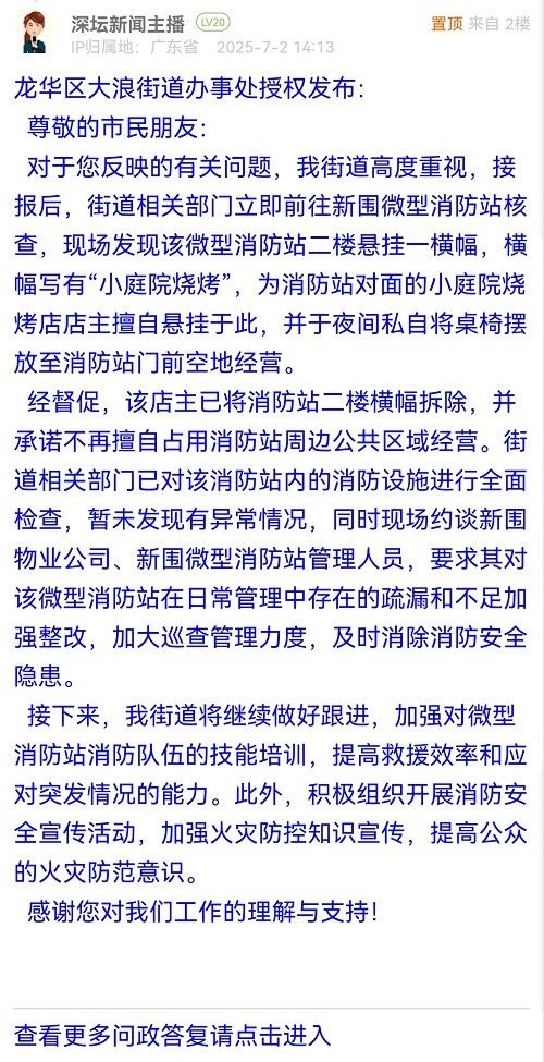 對(duì)于您反映的有關(guān)問題,我街道高度重視,接報(bào)后,街道相關(guān)部門立即前往新圍微型消防站核查,現(xiàn)場(chǎng)發(fā)現(xiàn)該微型消防站二樓懸掛一橫幅,橫幅寫有“小庭院燒烤”,為消防站對(duì)面的小庭院燒烤店店主擅自懸掛于此,并于夜間私自將桌椅擺放至消防站門前空地經(jīng)營(yíng)。