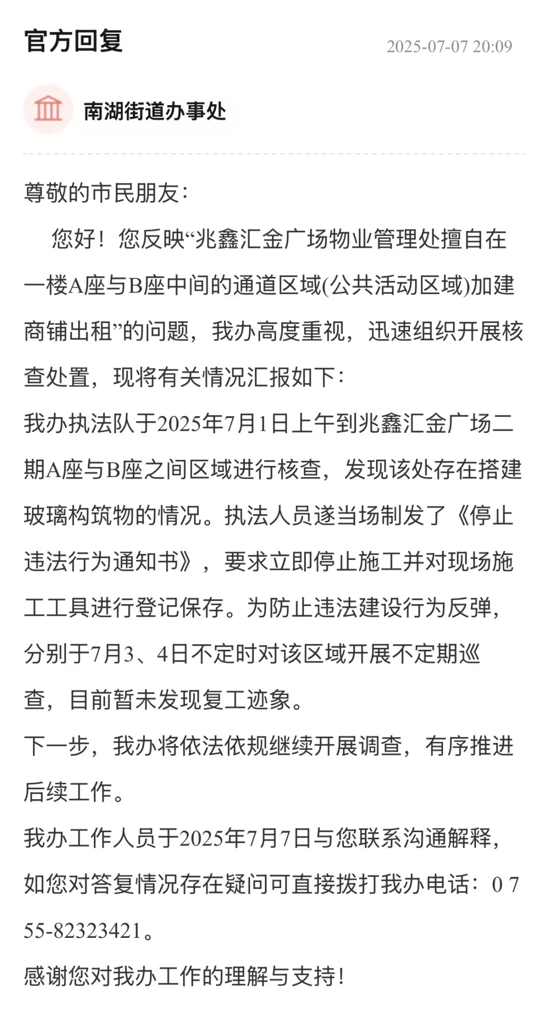 從市民反饋到執(zhí)法處置,羅湖區(qū)南湖街道辦事處以快速響應、精準執(zhí)法展現(xiàn)治理效能。通過現(xiàn)場核查、制發(fā)《停止違法行為通知書》、登記保存施工工具等措施,及時遏制違法搭建勢頭,并建立不定期巡查機制防止反彈。從“即時制止”到“長效監(jiān)督”的閉環(huán)管理,維護了業(yè)主合法權益與消防通道安全,為城市違建治理提供了高效務實的實踐樣本,彰顯基層執(zhí)法部門守護民生安全的責任擔當。