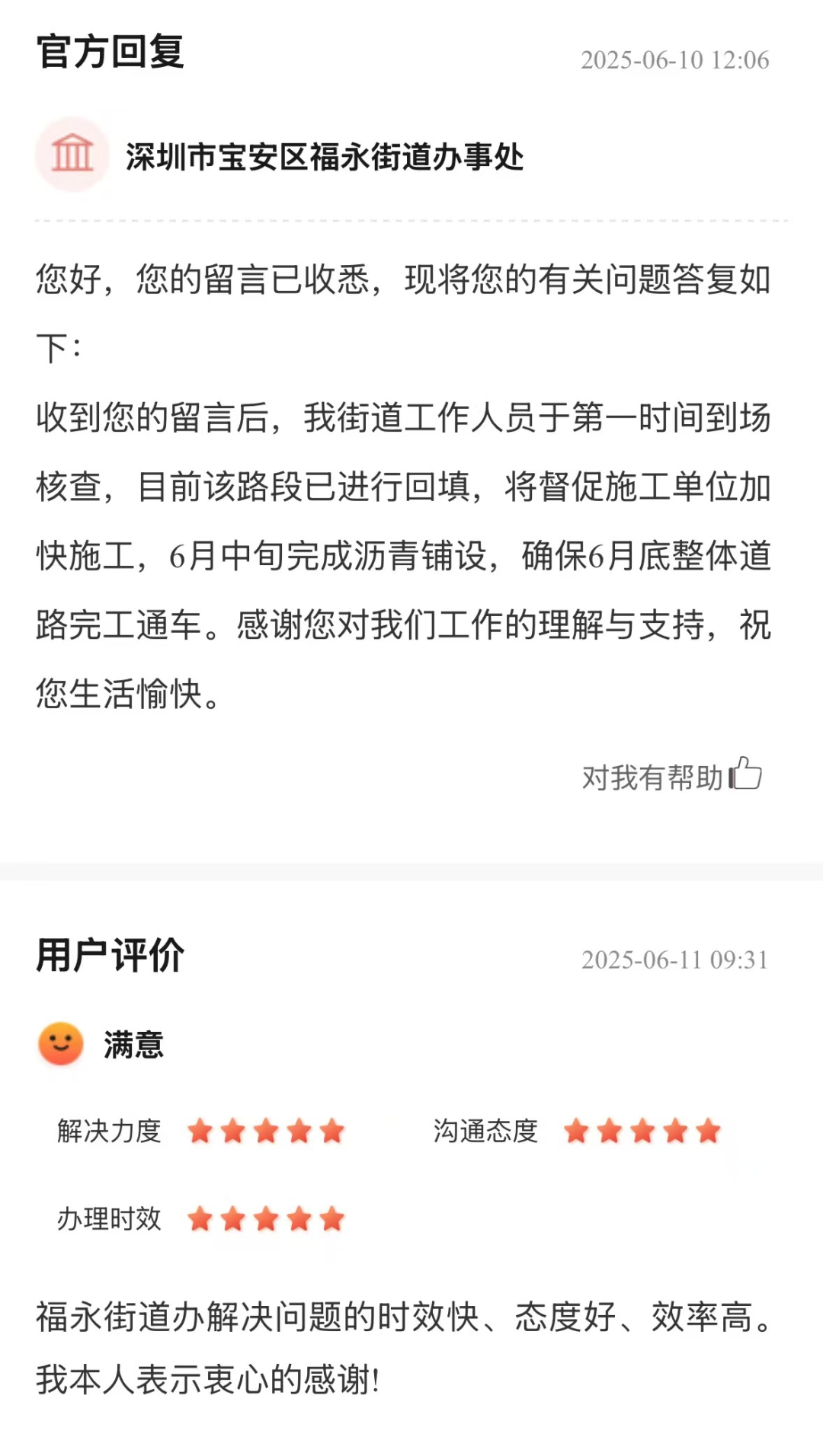 案例點評:道路銜接處的大坑大坎影響通行安全與道路順暢,亟待解決。街道辦收到留言后迅速行動,第一時間到場核查,明確將督促施工單位加快進度,在預計時間內(nèi)完成瀝青鋪設及道路整體完工,這些舉措體現(xiàn)了對道路通行問題的重視和高效的處理能力,為保障道路正常通行提供了有力保障,獲得了市民的滿意評價。