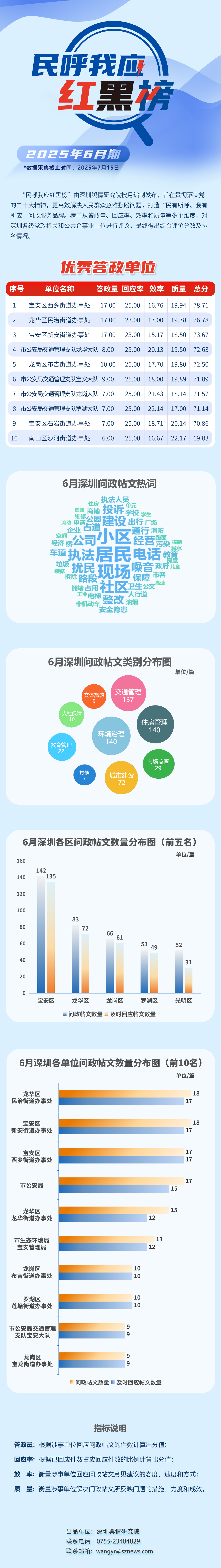 本期榜單采集的帖文主要來自深圳市及各區(qū)政府官網(wǎng)、深圳論壇、人民網(wǎng)領導留言板、深圳新聞網(wǎng)“民呼我應”等平臺,所采集帖文發(fā)布時間為2025年6月1日至6月30日,采集截止時間為2025年7月15日。