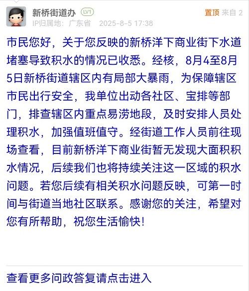 您好,獲悉情況后,我街道高度重視,工作人員立即到現(xiàn)場進(jìn)行核實(shí)處置。經(jīng)處置,該路段積水已清理完畢。同時(shí),街道已督促城市管家重點(diǎn)清理周邊雨水篦子,確保排水暢通,防止雨后積水。