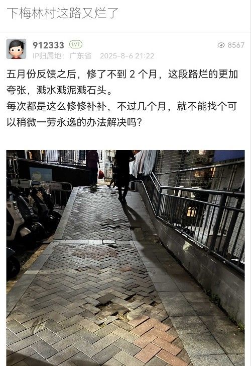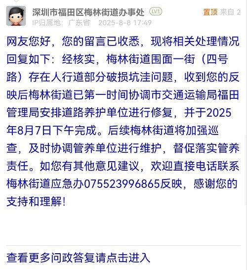 網(wǎng)友您好,您的留言已收悉,現(xiàn)將相關(guān)處理情況回復(fù)如下:經(jīng)核實(shí),梅林街道圍面一街(四號路)存在人行道部分破損坑洼問題,收到您的反映后梅林街道已第一時(shí)間協(xié)調(diào)市交通運(yùn)輸局福田管理局安排道路養(yǎng)護(hù)單位進(jìn)行修復(fù),并于2025年8月7日下午完成。后續(xù)梅林街道將加強(qiáng)巡查,及時(shí)協(xié)調(diào)管養(yǎng)單位進(jìn)行維護(hù),督促落實(shí)管養(yǎng)責(zé)任。如您有其他意見建議,歡迎直接電話聯(lián)系梅林街道應(yīng)急辦075523996865反映,感謝您的支持和理解!