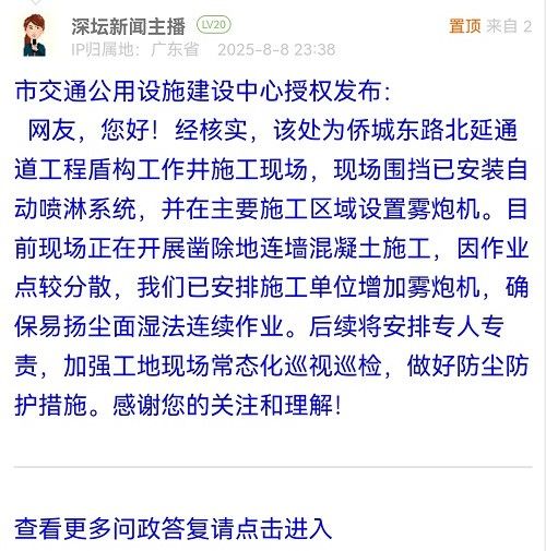 網(wǎng)友,您好!經(jīng)核實(shí),該處為僑城東路北延通道工程盾構(gòu)工作井施工現(xiàn)場,現(xiàn)場圍擋已安裝自動(dòng)噴淋系統(tǒng),并在主要施工區(qū)域設(shè)置霧炮機(jī)。目前現(xiàn)場正在開展鑿除地連墻混凝土施工,因作業(yè)點(diǎn)較分散,我們已安排施工單位增加霧炮機(jī),確保易揚(yáng)塵面濕法連續(xù)作業(yè)。后續(xù)將安排專人專責(zé),加強(qiáng)工地現(xiàn)場常態(tài)化巡視巡檢,做好防塵防護(hù)措施。感謝您的關(guān)注和理解!
