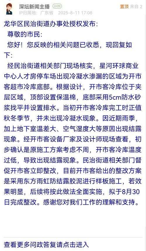 經(jīng)民治街道相關(guān)部門現(xiàn)場核實(shí),星河環(huán)球商業(yè)中心人才房停車場出現(xiàn)冷凝水滲漏的區(qū)域?yàn)殚_市客超市冷庫底部。根據(jù)設(shè)計(jì),開市客冷庫位于夾層區(qū)域,頂部設(shè)置保溫棉,底部采用5cm防水砂漿找平并設(shè)置排水。當(dāng)初開市客冷庫完工時(shí)正值秋冬季節(jié),并未出現(xiàn)冷凝水現(xiàn)象。因近期雨季,加上地下室溫差大、空氣濕度大等原因出現(xiàn)結(jié)露現(xiàn)象。經(jīng)開市客設(shè)備廠家及設(shè)計(jì)師現(xiàn)場查看,初步確認(rèn)是原施工方案考慮不周,開市客冷庫溫度過低,導(dǎo)致出現(xiàn)結(jié)露現(xiàn)象。民治街道相關(guān)部門督促開市客立即整改,目前開市客給出的整改方案是采用東方雨虹防結(jié)露膠泥進(jìn)行樣板施工,若效果明顯,后續(xù)將按此做法全面實(shí)施,擬于8月30日完成整改。感謝您對我們工作的理解和支持。