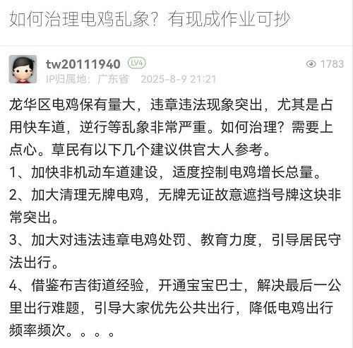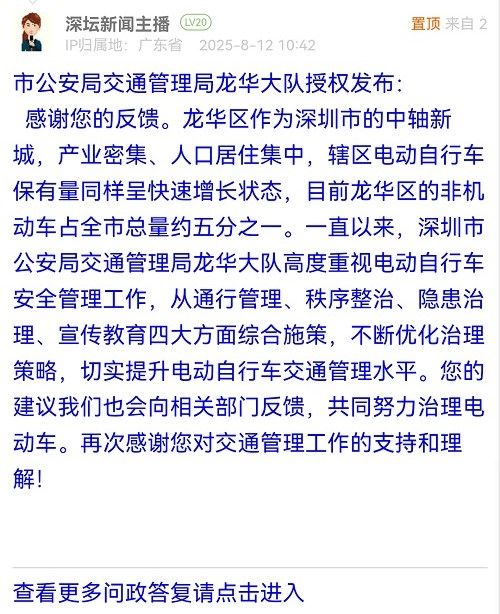 感謝您的反饋。龍華區(qū)作為深圳市的中軸新城,產(chǎn)業(yè)密集、人口居住集中,轄區(qū)電動(dòng)自行車保有量同樣呈快速增長狀態(tài),目前龍華區(qū)的非機(jī)動(dòng)車占全市總量約五分之一。一直以來,深圳市公安局交通管理局龍華大隊(duì)高度重視電動(dòng)自行車安全管理工作,從通行管理、秩序整治、隱患治理、宣傳教育四大方面綜合施策,不斷優(yōu)化治理策略,切實(shí)提升電動(dòng)自行車交通管理水平。您的建議我們也會(huì)向相關(guān)部門反饋,共同努力治理電動(dòng)車。再次感謝您對交通管理工作的支持和理解!
