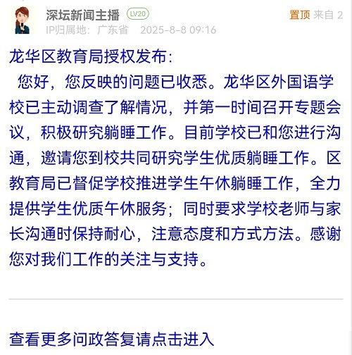 您好,您反映的問題已收悉。龍華區(qū)外國語學(xué)校已主動(dòng)調(diào)查了解情況,并第一時(shí)間召開專題會(huì)議,積極研究躺睡工作。目前學(xué)校已和您進(jìn)行溝通,邀請您到校共同研究學(xué)生優(yōu)質(zhì)躺睡工作。區(qū)教育局已督促學(xué)校推進(jìn)學(xué)生午休躺睡工作,全力提供學(xué)生優(yōu)質(zhì)午休服務(wù);同時(shí)要求學(xué)校老師與家長溝通時(shí)保持耐心,注意態(tài)度和方式方法。感謝您對我們工作的關(guān)注與支持。