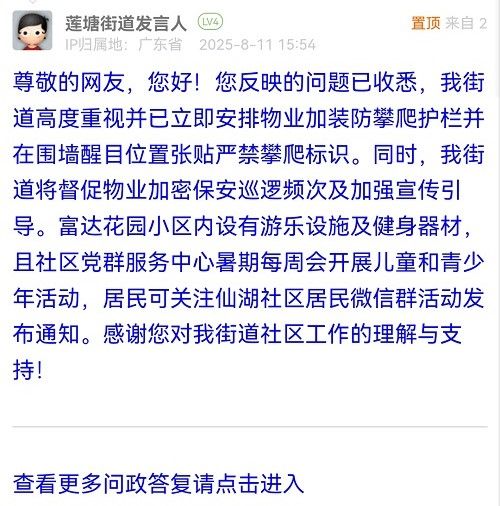尊敬的網(wǎng)友,您好!您反映的問題已收悉,我街道高度重視并已立即安排物業(yè)加裝防攀爬護(hù)欄并在圍墻醒目位置張貼嚴(yán)禁攀爬標(biāo)識。同時(shí),我街道將督促物業(yè)加密保安巡邏頻次及加強(qiáng)宣傳引導(dǎo)。富達(dá)花園小區(qū)內(nèi)設(shè)有游樂設(shè)施及健身器材,且社區(qū)黨群服務(wù)中心暑期每周會(huì)開展兒童和青少年活動(dòng),居民可關(guān)注仙湖社區(qū)居民微信群活動(dòng)發(fā)布通知。感謝您對我街道社區(qū)工作的理解與支持!