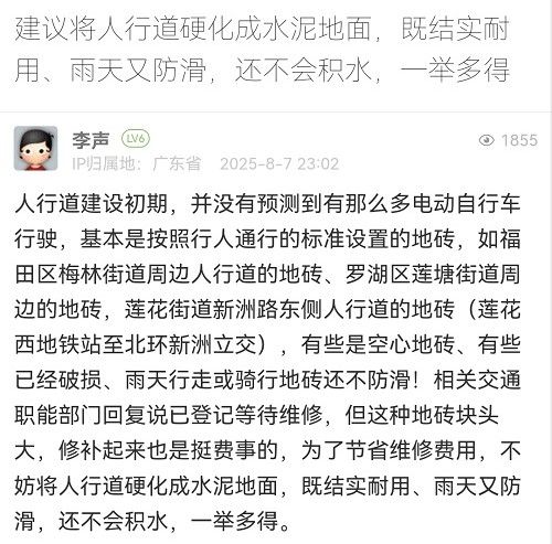 網(wǎng)友,您好!近年來,我們已對轄區(qū)內(nèi)部分電動(dòng)自行車通行量較大的道路,試點(diǎn)采用拉絲混凝土工藝進(jìn)行維修改造。下一步將結(jié)合年度養(yǎng)護(hù)計(jì)劃逐步推廣建設(shè)。感謝您的寶貴建議!