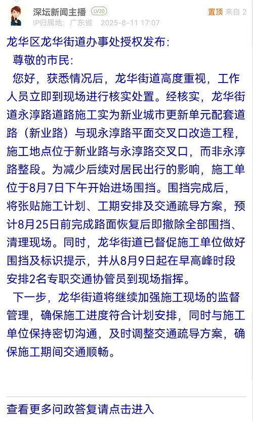 您好,獲悉情況后,龍華街道高度重視,工作人員立即到現(xiàn)場進(jìn)行核實(shí)處置。經(jīng)核實(shí),龍華街道永淳路道路施工實(shí)為新業(yè)城市更新單元配套道路(新業(yè)路)與現(xiàn)永淳路平面交叉口改造工程,施工地點(diǎn)位于新業(yè)路與永淳路交叉口,而非永淳路整段。為減少后續(xù)對居民出行的影響,施工單位于8月7日下午開始進(jìn)場圍擋。圍擋完成后,將張貼施工計(jì)劃、工期安排及交通疏導(dǎo)方案,預(yù)計(jì)8月25日前完成路面恢復(fù)后即撤除全部圍擋、清理現(xiàn)場。同時(shí),龍華街道已督促施工單位做好圍擋及標(biāo)識提示,并從8月9日起在早高峰時(shí)段安排2名專職交通協(xié)管員到現(xiàn)場指揮。