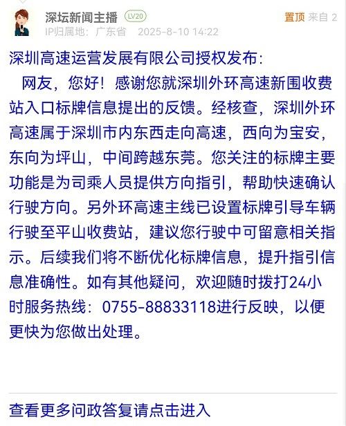 網(wǎng)友,您好!感謝您就深圳外環(huán)高速新圍收費(fèi)站入口標(biāo)牌信息提出的反饋。經(jīng)核查,深圳外環(huán)高速屬于深圳市內(nèi)東西走向高速,西向?yàn)閷毎?,東向?yàn)槠荷?,中間跨越東莞。您關(guān)注的標(biāo)牌主要功能是為司乘人員提供方向指引,幫助快速確認(rèn)行駛方向。另外環(huán)高速主線已設(shè)置標(biāo)牌引導(dǎo)車輛行駛至平山收費(fèi)站,建議您行駛中可留意相關(guān)指示。后續(xù)我們將不斷優(yōu)化標(biāo)牌信息,提升指引信息準(zhǔn)確性。如有其他疑問,歡迎隨時(shí)撥打24小時(shí)服務(wù)熱線:0755-88833118進(jìn)行反映,以便更快為您做出處理。