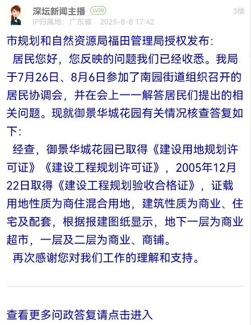 (三)關(guān)于“消防、環(huán)保、安全”等問題:經(jīng)向相關(guān)部門了解,該項(xiàng)目尚未進(jìn)入相關(guān)的規(guī)劃變更、環(huán)保備案及消防審批等程序,街道已于8月6日再次就規(guī)劃、消防等問題約談龍勝公司負(fù)責(zé)人,負(fù)責(zé)人表示改建電子市場目前仍處于規(guī)劃階段,公司已暫時(shí)停止實(shí)施該商業(yè)項(xiàng)目。