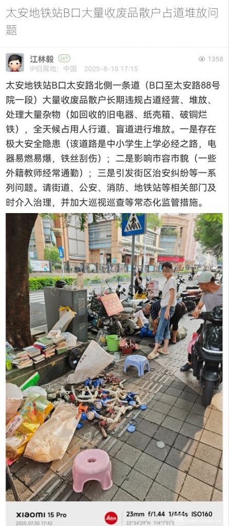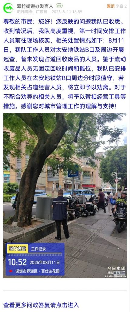 尊敬的市民:您好!您反映的問題我隊(duì)已收悉。收到情況后,我隊(duì)高度重視,第一時(shí)間安排工作人員前往現(xiàn)場核實(shí),相關(guān)處置情況如下:8月11日,我隊(duì)工作人員對太安地鐵站B口及周邊開展巡查,暫未發(fā)現(xiàn)占道回收廢品的人員。鑒于流動(dòng)收廢品人員無固定回收時(shí)間和攤位,我隊(duì)已安排工作人員在太安地鐵站B口周邊分時(shí)段值守,若發(fā)現(xiàn)相關(guān)占道經(jīng)營人員,將立即予以勸離。對于不配合勸導(dǎo)的相關(guān)人員,將予以暫扣經(jīng)營工具等措施。感謝您對城市管理工作的理解與支持!