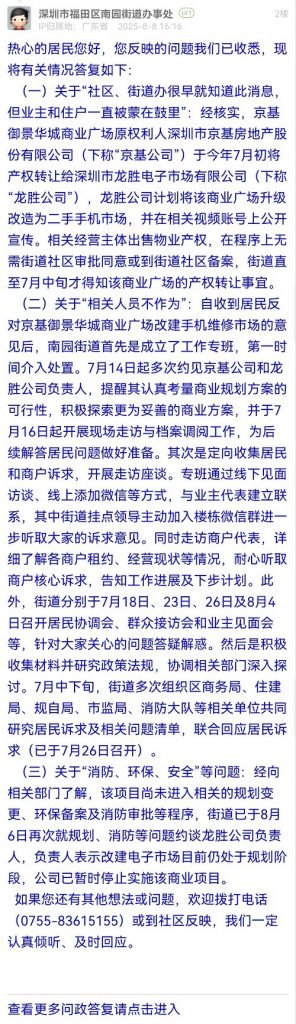 (二)關(guān)于“相關(guān)人員不作為”:自收到居民反對京基御景華城商業(yè)廣場改建手機(jī)維修市場的意見后,南園街道首先是成立了工作專班,第一時(shí)間介入處置。7月14日起多次約見京基公司和龍勝公司負(fù)責(zé)人,提醒其認(rèn)真考量商業(yè)規(guī)劃方案的可行性,積極探索更為妥善的商業(yè)方案,并于7月16日起開展現(xiàn)場走訪與檔案調(diào)閱工作,為后續(xù)解答居民問題做好準(zhǔn)備。其次是定向收集居民和商戶訴求,開展走訪座談。專班通過線下見面訪談、線上添加微信等方式,與業(yè)主代表建立聯(lián)系,其中街道掛點(diǎn)領(lǐng)導(dǎo)主動(dòng)加入樓棟微信群進(jìn)一步聽取大家的訴求意見。同時(shí)走訪商戶代表,詳細(xì)了解各商戶租約、經(jīng)營現(xiàn)狀等情況,耐心聽取商戶核心訴求,告知工作進(jìn)展及下步計(jì)劃。此外,街道分別于7月18日、23日、26日及8月4日召開居民協(xié)調(diào)會(huì)、群眾接訪會(huì)和業(yè)主見面會(huì)等,針對大家關(guān)心的問題答疑解惑。然后是積極收集材料并研究政策法規(guī),協(xié)調(diào)相關(guān)部門深入探討。7月中下旬,街道多次組織區(qū)商務(wù)局、住建局、規(guī)自局、市監(jiān)局、消防大隊(duì)等相關(guān)單位共同研究居民訴求及相關(guān)問題清單,聯(lián)合回應(yīng)居民訴求(已于7月26日召開)。