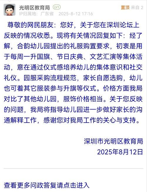 尊敬的網(wǎng)民朋友:您好,關(guān)于您在深圳論壇上反映的情況收悉。現(xiàn)將有關(guān)情況回復(fù)如下:經(jīng)了解,合韻幼兒園提出的禮服購置要求,初衷是用于每周一升國旗、節(jié)日慶典、文藝匯演等集體活動(dòng),意在通過儀式感培養(yǎng)幼兒的集體意識和社交禮儀。園服采購流程規(guī)范,家長自愿選購,幼兒也可著其它服裝參與升旗等儀式。價(jià)格方面我局對比了其他幼兒園,服飾價(jià)格相當(dāng)。關(guān)于您反映的問題,我局將指導(dǎo)幼兒園進(jìn)一步做好家長的溝通解釋工作,感謝您對我局工作的關(guān)心與支持。
