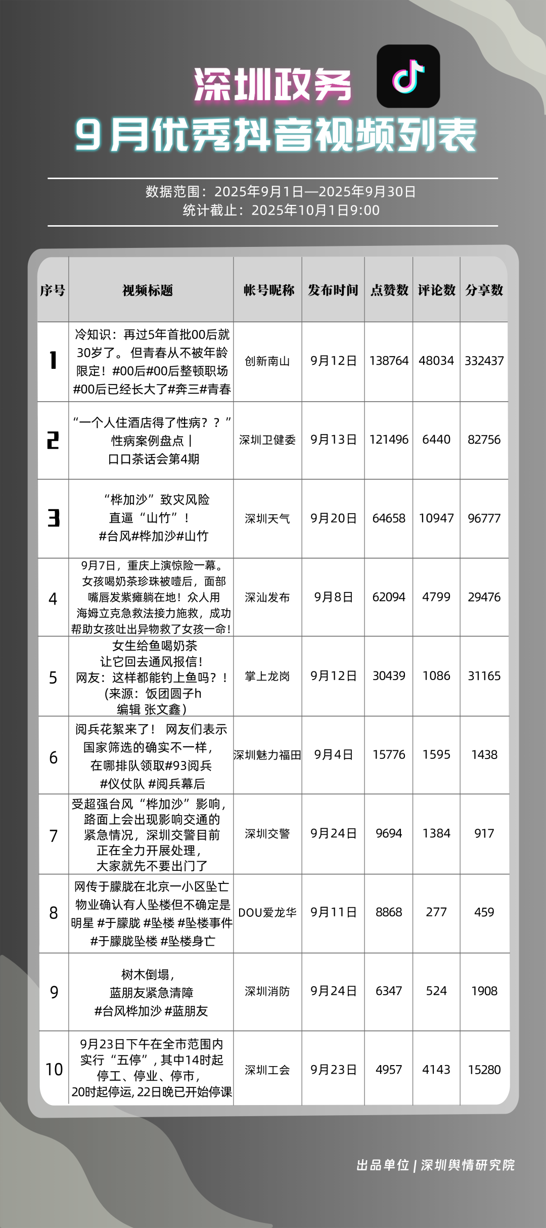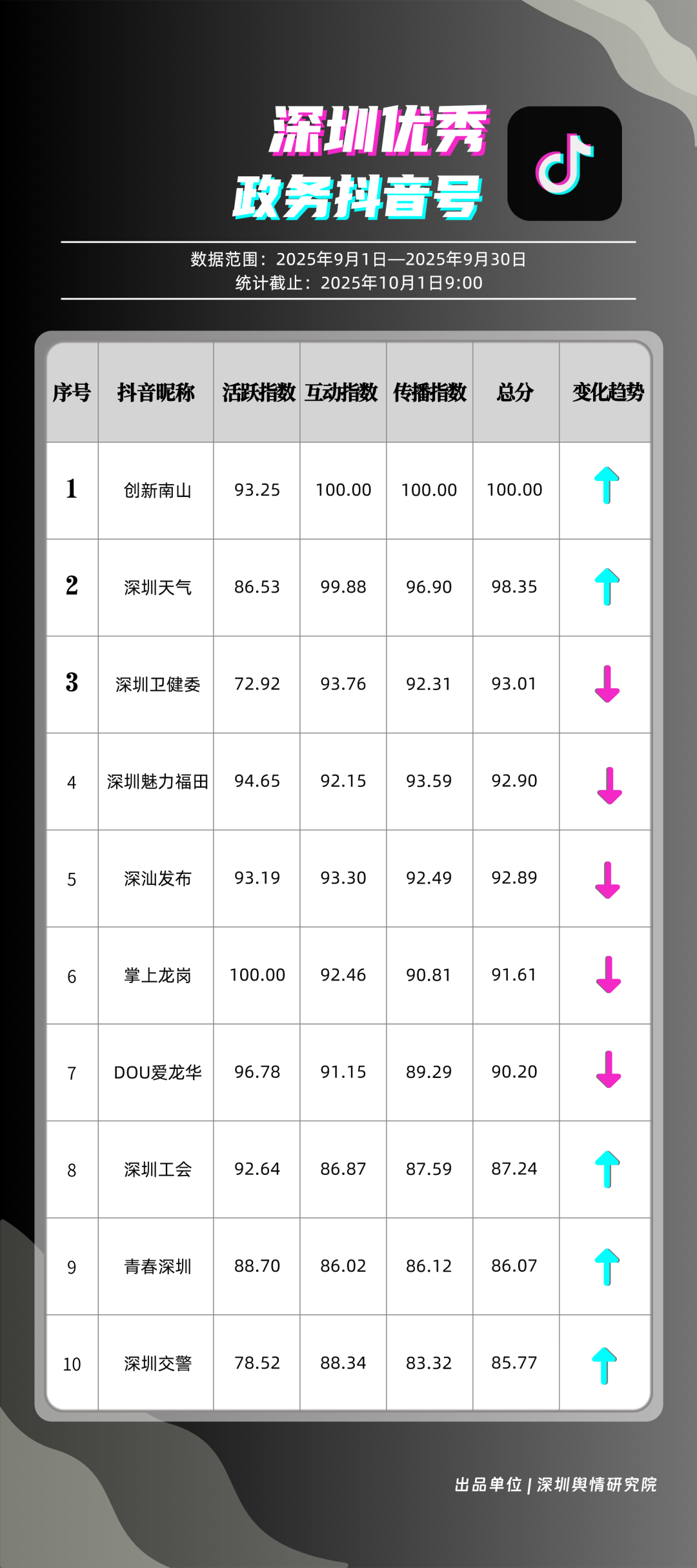 9月,獲得“優(yōu)秀政務(wù)抖音號(hào)”稱號(hào)的是“創(chuàng)新南山”“深圳天氣”“深圳衛(wèi)健委”“深圳魅力福田”“深汕發(fā)布”“掌上龍崗”“DOU愛(ài)龍華”“深圳工會(huì)”“青春深圳”“深圳交警”。“創(chuàng)新南山”以一條有關(guān)“青春不被年齡限定”的視頻獲得超34萬(wàn)次轉(zhuǎn)發(fā),超14萬(wàn)次點(diǎn)贊,助力其在抖音榜單居于榜首;“深圳天氣”多條臺(tái)風(fēng)相關(guān)視頻吸引大量網(wǎng)民關(guān)注、互動(dòng),在抖音平臺(tái)得分超98分;“深圳衛(wèi)健委”“深圳魅力福田”“深汕發(fā)布”等賬號(hào)緊隨其后,得分均在92分以上。上榜的優(yōu)秀政務(wù)抖音號(hào)以“有溫度”的敘事表達(dá),將宣傳、服務(wù)內(nèi)容轉(zhuǎn)化為網(wǎng)民喜聞樂(lè)見(jiàn)的視頻,收獲高點(diǎn)贊、高轉(zhuǎn)發(fā)的流量實(shí)績(jī),更在評(píng)論區(qū)形成了良性互動(dòng)生態(tài),深度運(yùn)營(yíng)收獲了較好成果。