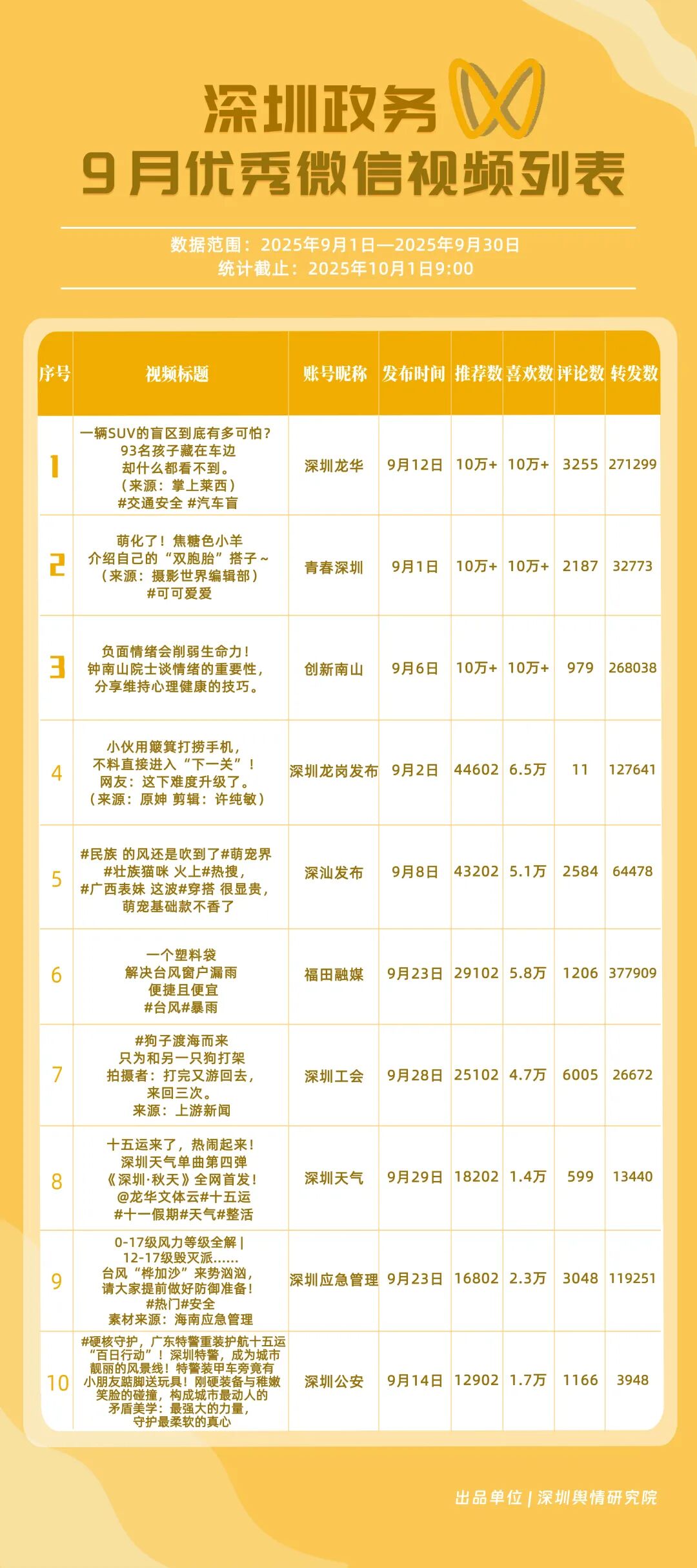 9月,“創(chuàng)新南山”“深圳天氣”“深圳龍華”“深汕發(fā)布”“青春深圳”“福田融媒”“深圳龍崗發(fā)布”“深圳工會(huì)”“深圳應(yīng)急管理”“深圳衛(wèi)健委”上榜“優(yōu)秀政務(wù)微信視頻號(hào)”。其中,“創(chuàng)新南山”以滿分位列榜單第一名,其一條轉(zhuǎn)載視頻關(guān)注個(gè)人情緒及心理健康,視頻推薦、喜歡、轉(zhuǎn)發(fā)均超過(guò)10萬(wàn)次;“深圳天氣”列榜單第二名,其有關(guān)單曲《深圳·秋天》、臺(tái)風(fēng)“樺加沙”防御作品在微信視頻號(hào)平臺(tái)獲得較高關(guān)注度;“深圳龍華”得分也逼近滿分,其轉(zhuǎn)載的視頻“一輛SUV的盲區(qū)到底有多可怕”獲得大量網(wǎng)民的推薦;“深汕發(fā)布”“青春深圳”等賬號(hào)同樣獲得不錯(cuò)的成績(jī)。上榜微信視頻號(hào)以短視頻為核心載體,將政務(wù)信息、民生服務(wù)、科普知識(shí)等內(nèi)容進(jìn)行場(chǎng)景化呈現(xiàn),為政務(wù)新媒體在視頻化傳播時(shí)代的創(chuàng)新發(fā)展提供了有益借鑒。